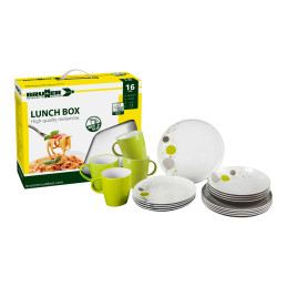 Zestaw stołowy Astralys, 36 elementów, wykonany z trwałej melaminy, idealny na pikniki i kemping. Zawiera talerze, filiżanki, szklanki i sztućce dla 4 osób. Praktyczne pudełko transportowe ułatwia przechowywanie.