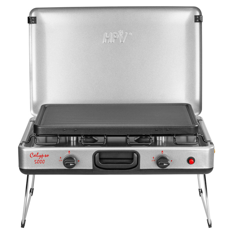 Na kemping, piknik i taras. Stylowa kuchenka dwupalnikowa i grill z emaliowanym rusztem i patelnią grillową z powłoką nieprzywierającą. Wyposażona w dwa mocne palniki o mocy 2,5 kW, zapłon piezoelektryczny i rurę przyłączeniową o długości 80 cm, w zintegrowanym schowku w eleganckiej, malowanej proszkowo obudowie z uchwytem. Zużycie: 190 g/h na palnik przy pełnym ogniu, 65 g/h na palnik przy niskim ogniu (ustawienie grilla).