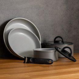 Ten zestaw zachwyca kompaktowymi rozmiarami i oferuje optymalną wygodę użytkowania podczas gotowania. Ważne są nie tylko aspekty praktyczne, ale także ekologiczność i jakość: Wykonany w 100% z recyklingowanego aluminium i wyposażony w innowacyjną, opatentowaną powłokę FINEGRES, która wykorzystuje wyłącznie składniki mineralne, zestaw charakteryzuje się trwałością, szybkim nagrzewaniem i doskonałą powłoką zapobiegającą przywieraniu. Nadaje się do wszystkich rodzajów kuchenek.