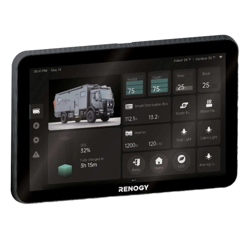 Jeden dotykowy panel do podglądu produkcji/zużycia, stanu akumulatora (SOC), alarmów i kontroli urządzeń w systemie Renogy (m.in. ONE Core + smart distribution box).