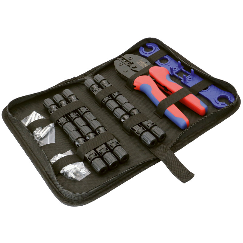 Zestaw narzędzi solarnych NL MC4 zawiera wszystko, co potrzebne do pracy z kablami i złączami solarnymi. Narzędzie do zaciskania ułatwia skracanie kabli solarnych lub tworzenie przedłużeń kablowych. Zestaw dostarczany jest w torbie narzędziowej z różnymi złączami MC4 i pasującymi pinami.