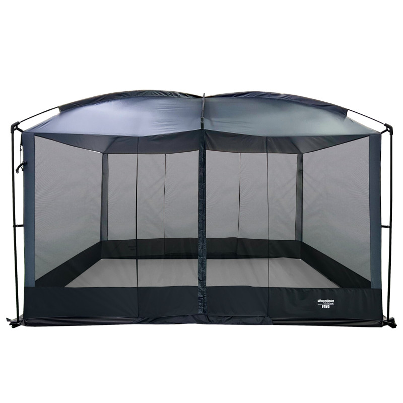 Pawilon Pavo oferuje przestronne poczucie przestrzeni dzięki otwartej konstrukcji dookoła oraz dużym siatkowym oknom, zapewniając niezawodną ochronę przed owadami i pogodą. Lekki materiał HydraDore®-SL jest odporny na warunki atmosferyczne i szybko schnie. Dwa pełnowymiarowe wejścia z magnetycznymi zamknięciami zamykają się automatycznie. Mały rozmiar po złożeniu w kompaktowej torbie sportowej pozwala na rozstawienie w zaledwie kilka minut – idealny do ogrodu, na kemping i w podróży.