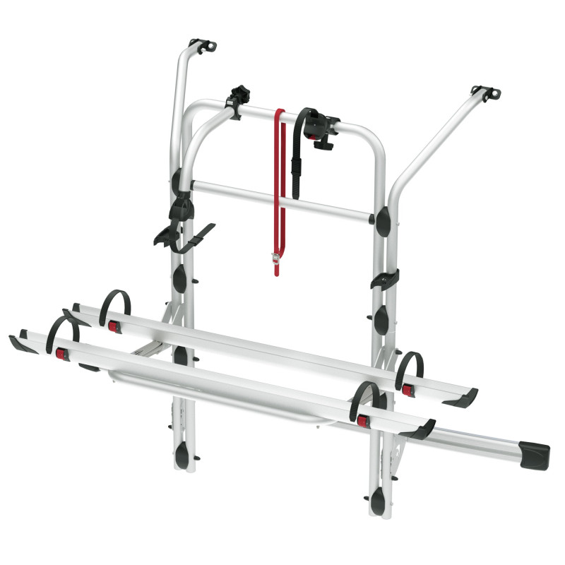 Bagażnik rowerowy Fiamma Carry-Bike dedykowany do Renault Trafic D i Opel Vivaro B (2014-2019) z podwójnymi drzwiami tylnymi. Lekki aluminiowy model o wadze netto 7,3 kg, w zestawie z blokami na e-rowery i akcesoriami montażowymi. Idealny do bezpiecznego przewozu rowerów podczas kempingowych wypraw.