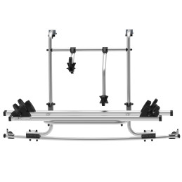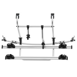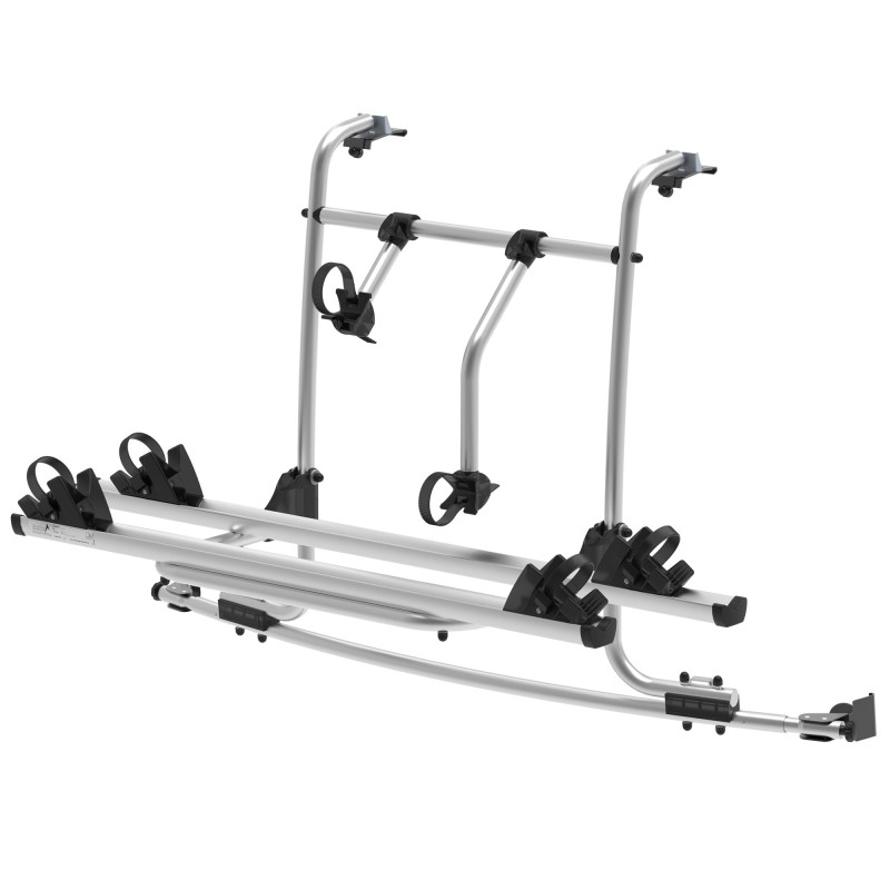 Solidny bagażnik rowerowy EuroCarry na 2 rowery, montowany na prawe tylne drzwi kamperów Mercedes Sprinter, VW LT, Fiat Ducato i Peugeot Boxer (1994-2006). Wykonany z anodowanej rury aluminiowej (waga netto 9,6 kg), z pełnym zestawem mocowań w zestawie. Idealny do bezpiecznego transportu na kempingu – szerokość 125 cm, wysokość 129 cm.