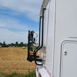 Solidny bagażnik rowerowy EuroCarry na 2 rowery, montowany na prawe tylne drzwi kamperów Mercedes Sprinter, VW LT, Fiat Ducato i Peugeot Boxer (1994-2006). Wykonany z anodowanej rury aluminiowej (waga netto 9,6 kg), z pełnym zestawem mocowań w zestawie. Idealny do bezpiecznego transportu na kempingu – szerokość 125 cm, wysokość 129 cm.