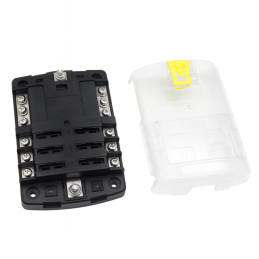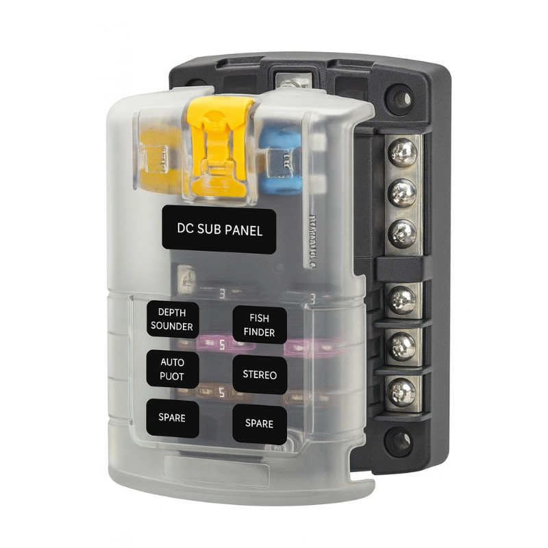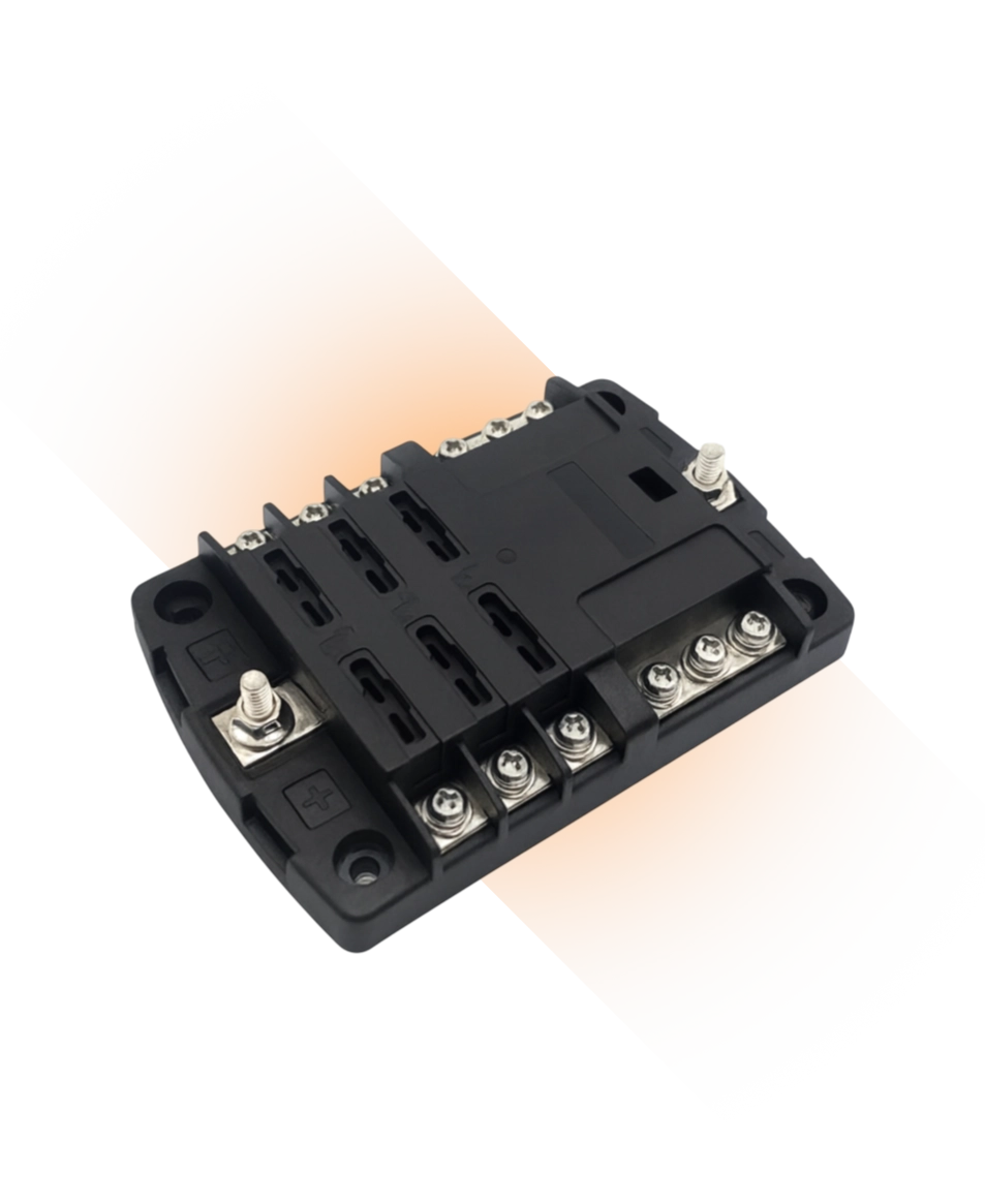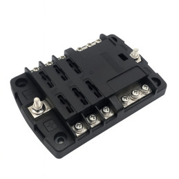 Wysokiej jakości, 6-obwodowy blok bezpieczników z szyną ujemną i przezroczystą, zatrzaskową pokrywą, przeznaczony do instalacji 12 V i 24 V w łodziach, kamperach, samochodach i pojazdach off-road. Obsługuje standardowe bezpieczniki płaskie ATO/ATC (max 30 A na obwód, 100 A na cały blok), posiada solidną konstrukcję z poliwęglanu i cynowanych szyn miedzianych