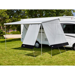 Thule Rain Blocker G2 Side to boczny panel ochronny dla Fiat Ducato H2 z Pop-Top, wykonany z wodoodpornego PVC (RAL 9002) z wysuwem 2,5 m. Zapewnia skuteczną ochronę przed deszczem, słońcem, wiatrem i spojrzeniami, tworząc prywatną przestrzeń pod markizą Omnistor 5200. Łatwy montaż za pomocą krokwi napinających – idealny do kempingu!