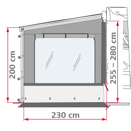 Ściana boczna z dużym oknem z rolowanymi roletami zaciemniającymi (po lewej lub prawej stronie) oraz przedłużeniem podłogi. Wykonana z wodoodpornego, odpornego na UV i zmywalnego winylu. W zestawie szary błotnik.