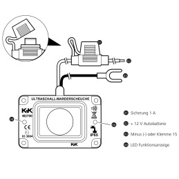 Wodoodporny, odporny na zabrudzenia ultradźwiękowy odstraszacz kun skutecznie zapobiega uszkodzeniom spowodowanym gryzieniem. Dzięki głośnikowi kopułowemu 360° może być montowany bezpośrednio w komorze silnika, nawet w miejscach narażonych na działanie wody rozpryskowej, tworząc wszechstronną barierę ultradźwiękową bez cieni akustycznych. Wykonany z samogasnącego plastiku, z oznaczeniem E1, odpowiedni dla wszystkich generacji silników. Wymiary jednostki bazowej: 8,5 × 5,3 × 4,2 cm.