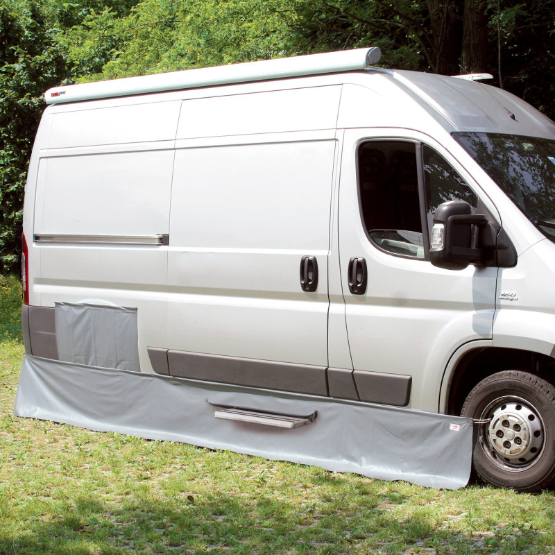 Opcjonalny panel przeciwwiatrowy Fiamma zapobiega przeciągom pod kamperem i idealnie pasuje do Privacy Rooms o długości do 550 cm – można go łatwo skrócić. Wykonany z trwałego 100% PVC w kolorze ciemnoszarym, waży tylko 1,7 kg i montuje się błyskawicznie za pomocą przycisków zatrzaskowych. Idealny wybór dla komfortu kempingowego.