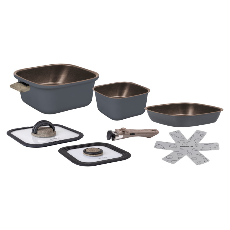 Idealne do małych kuchni, kamperów lub łodzi. Kwadratowe, trwałe i możliwe do układania w stosy, z odłączanymi uchwytami. Wykonane z aluminium pochodzącego z recyklingu. W zestawie szklane pokrywki. Nadają się do kuchenek indukcyjnych.