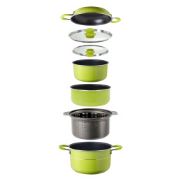 Kompaktowy 11-elementowy zestaw garnków COOK®VISION Nesto ze zdejmowanymi uchwytami – idealny na kemping, oszczędza miejsce dzięki układaniu w stos. Ze stali nierdzewnej z termo-sandwichową podstawą, pasuje do wszystkich płyt. Szczelne pokrywki i nieprzywierająca patelnia ułatwiają gotowanie w podróży.