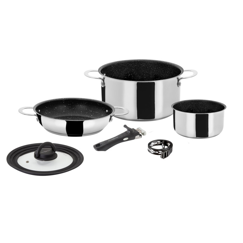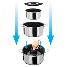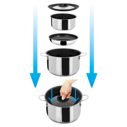 Wysokiej jakości kolekcja garnków ze stali nierdzewnej z powłoką nieprzywierającą. Oszczędzający miejsce design. Szczególnie odpowiedni do pojazdów rekreacyjnych i łodzi. Duży garnek i patelnia wyposażone są w solidne uchwyty oraz termiczną podstawę. Nadają się do kuchenek gazowych, elektrycznych, ceramicznych i indukcyjnych. Można myć w zmywarce. Z systemem Vacublock.