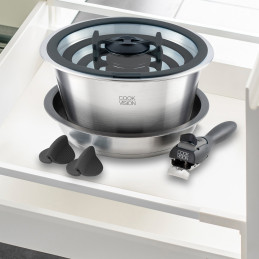 Zestaw garnków B/R/K Click-On (10 szt.) z opatentowanymi, zdejmowanymi uchwytami pozwala na wygodne gotowanie, sztaplowanie i serwowanie prosto ze stołu. Wykonany ze stali nierdzewnej 18/10 z nieprzywierającą powłoką ceramiczną bez PFAS, z termo-dnem na wszystkie kuchenki – idealny do kampera. Wszechstronny, trwały i praktyczny!
