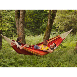 Hamak Amazonas Paradiso Tropical o szerokości 175 cm to brazylijski gigant tkany z prawie 5000 nici dla wyjątkowej miękkości i wytrzymałości do 200 kg. Wykonany z 85% bawełny i 15% poliestru, waży tylko 2,5 kg i pomieści powierzchnię 250 x 175 cm. Idealny do relaksu na kempingu w kolorowym, tropikalnym wzorze.
