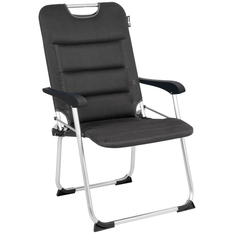 Krzesło kempingowe z aluminiową ramą malowaną proszkowo i oddychającą osłoną FULL-3D. Metalowo wzmocnione podłokietniki do regulacji oparcia. Osłona odporna na UV i szybkoschnąca.