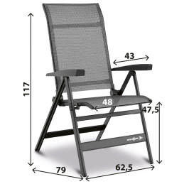 Krzesło kempingowe z aluminiową ramą malowaną proszkowo i oddychającą osłoną FULL-3D. Metalowo wzmocnione podłokietniki do regulacji oparcia. Osłona odporna na UV i szybkoschnąca.