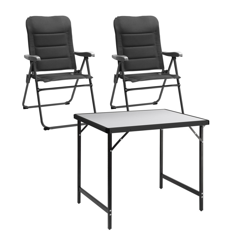 Wyściełane krzesło kempingowe ze standardowym zagłówkiem. Oparcie regulowane w 8 pozycjach, zagłówek z płynną regulacją wysokości. Pokrycie odporne na zabrudzenia i wodę.
