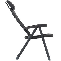 Krzesło kempingowe z innowacyjną ramą w kształcie litery L, umożliwiającą kompaktowe przechowywanie. Oparcie regulowane w 8 pozycjach. Wyściełana tkanina 3Durafeel Pro, technologia cięcia laserowego.