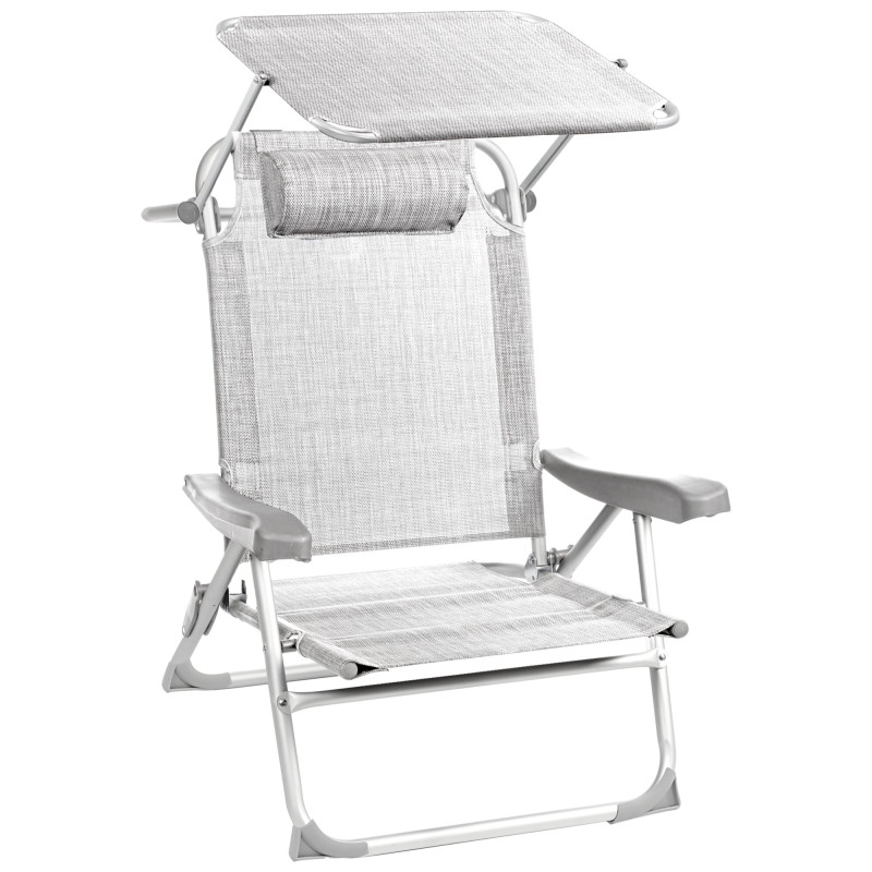 Leżak plażowy z regulowanym oparciem w 5 pozycjach, rozkładanym do pozycji leżącej. Siedzisko 47 x 35 cm na wysokości 25 cm. Materiał Textilene, aluminiowa rama. Zagłówek i paski na ramię w zestawie.