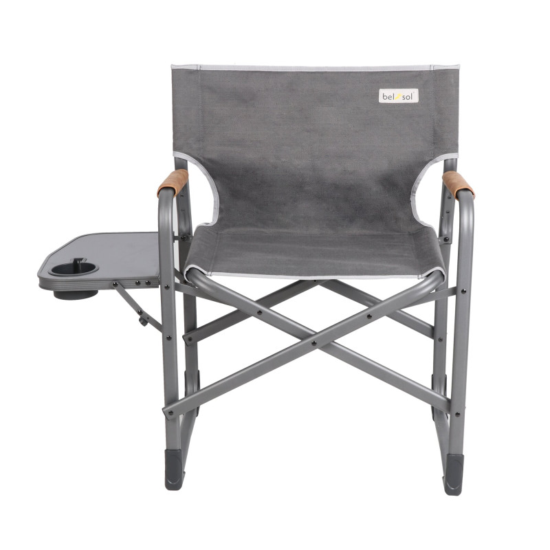 Krzesło reżyserskie z odłączanym stolikiem bocznym (udźwig do 5 kg) i ulepszonymi podłokietnikami. Składane.