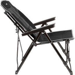 Składane krzesło kempingowe z bocznym wsparciem siedziska. Owalna, malowana proszkowo rama stalowa. Duże, regulowane podstawy stóp. Pokrycie z wytrzymałego poliestru.