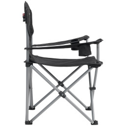 Składane krzesło kempingowe z bocznym wsparciem siedziska. Owalna, malowana proszkowo rama stalowa. Duże, regulowane podstawy stóp. Pokrycie z wytrzymałego poliestru.