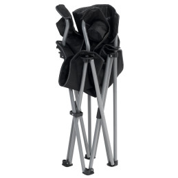 Składany fotel kempingowy z podłokietnikami. Wysokość siedziska 45 cm, powierzchnia siedziska 51 x 46 cm. Wysokie oparcie, stalowa rama. Duże podstawy nóg. Torba w zestawie.