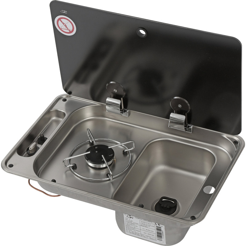 Kompaktowa kombinacja kuchenki i zlewu Dometic CVC 1525G z pokrywą ze szkła bezpiecznego i automatycznym odcięciem gazu po zamknięciu. Moc 1,1 kW, zużycie gazu tylko 80 g/h, zapłon elektryczny 12V – idealna do kampera. Waga netto 4,5 kg, łatwy montaż (głębokość 17 cm).
