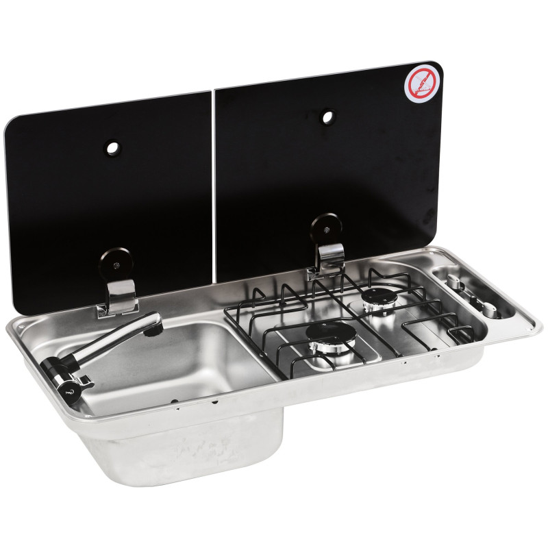 Kuchenka z umywalką Dometic MO 9222L (umywalka po lewej): kompaktowa kombinacja z 2 palnikami (1,6 kW), szklanymi pokrywami jako blatem, piezozapłonem i zabezpieczeniem. Wymiary: 90x37x15,2 cm, zużycie gazu: 204 g/h. Idealna do kamperów!