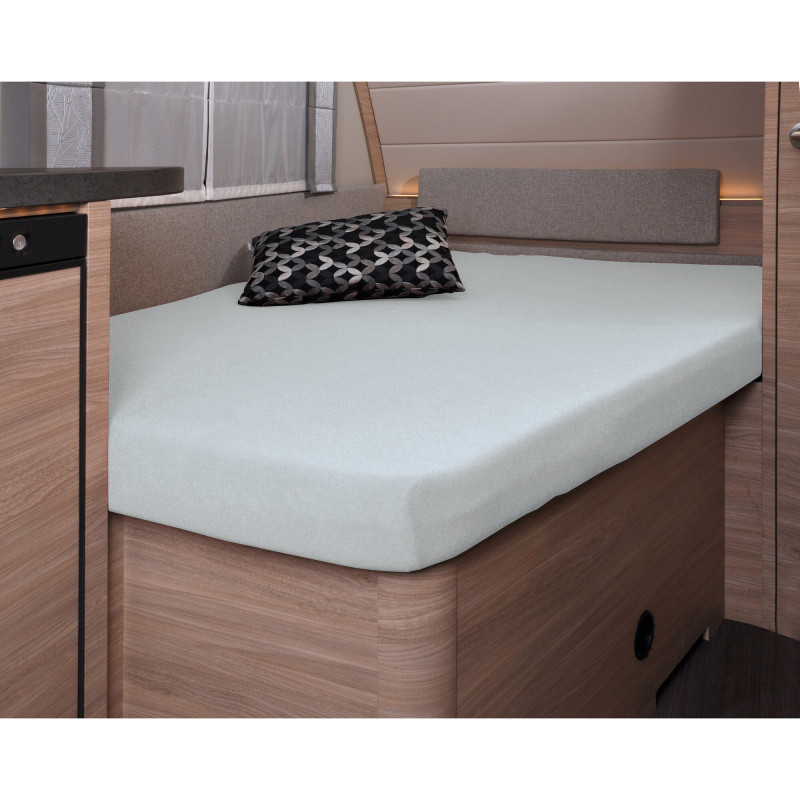 Prześcieradło z gumką o wymiarach 142 x 195 cm (158/42 cm) do łóżka francuskiego w kamperze. Specjalny kształt ze skośnymi rogami dopasowany do niestandardowych materacy w pojazdach rekreacyjnych.