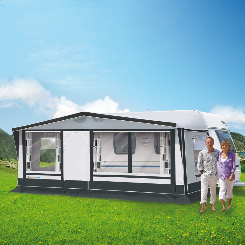 Markiza całoroczna Grönland to idealne rozwiązanie dla stałych kamperów. Wyposażona w pasy sztormowe, mereżkę, trzy kanały dachowe i narożnik Vario, zapewnia doskonałe dopasowanie do przyczepy kempingowej.