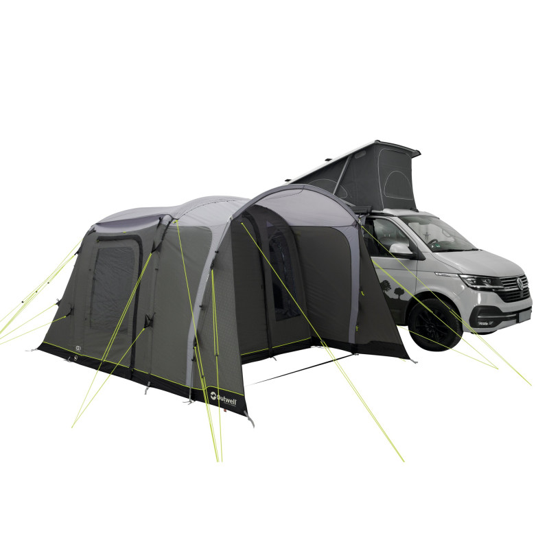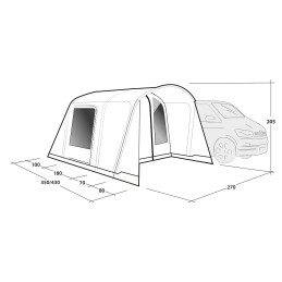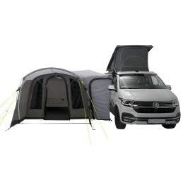 Markiza podróżna do furgonetki z klejonymi szwami i fartuchem ochronnym. Wyposażona w duże okna panoramiczne, zasłony, drzwi zwijane na bok oraz okna wentylacyjne z klapami. Stabilna dzięki teleskopowym drążkom.