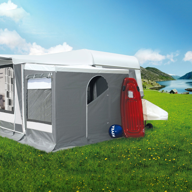 Markiza całoroczna Kaprun DC to wysokiej jakości produkt zimowy i całoroczny, zapewniający komfort przez cały rok. Wyposażona w okna i drzwi z zamkami błyskawicznymi (od rozmiaru 280), wykonana z trwałej tkaniny Trevira z powłoką PVC.