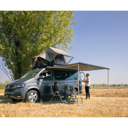 Namiot dachowy dla minivanów i SUV-ów jest idealny na wakacje w środku natury. Namiot jest mocowany na relingach dachowych, które muszą mieć minimalną nośność 75 kg i użyteczną szerokość co najmniej 78 cm. Namiot dachowy można szybko i łatwo złożyć, a także używać razem z markizą ścienną. Wersja 140 oferuje miejsce dla 2 osób, wersja 180 dla 3 osób. Obie są wyposażone w siatki przeciw owadom i rolety zaciemniające na wszystkich czterech stronach, osłonę przeciwdeszczową, okna i zamki YKK. Podstawa składa się z aluminiowej płyty o strukturze plastra miodu. Zintegrowany materac ma grubość 5 cm i składa się z dwóch rodzajów pianki o różnej grubości. Do namiotu dachowego można łatwo dotrzeć za pomocą aluminiowej drabiny o długości 2,30 m (maks. nośność 150 kg). Wodoodporna osłona chroni przed deszczem, a wewnętrzna taśma LED z regulowaną intensywnością światła zapewnia odpowiednie oświetlenie. Akcesoria można schludnie przechowywać w kieszeniach.