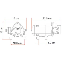 Pompa jest odporna na osadzanie się kamienia i utlenianie oraz może pracować na sucho. Może pracować w dowolnej pozycji. W zestawie jeden kątowy i jeden prosty uchwyt węża do węży średnica 13 mm. Wersja standardowa z automatycznym wyłącznikiem ciśnieniowym przy 1,5 bara do bojlerów Truma.