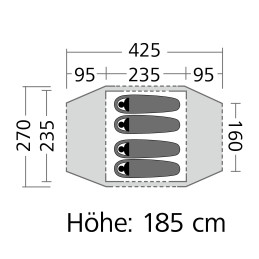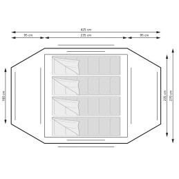 Dzięki przestronnemu namiotowi wewnętrznemu Odyssey 4 zapewnia wystarczająco dużo miejsca dla maksymalnie 4 osób. Namiot wewnętrzny oferuje przestrzeń nad głową i posiada 4 drzwi wejściowe wyposażone w moskitiery dla idealnej cyrkulacji powietrza. Co więcej, drzwi wejściowe można zwinąć, zapewniając dużo światła w namiocie. Przedsionek oferuje dużo miejsca na naczynia kuchenne i bagaż.