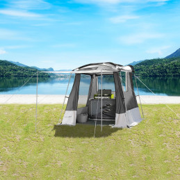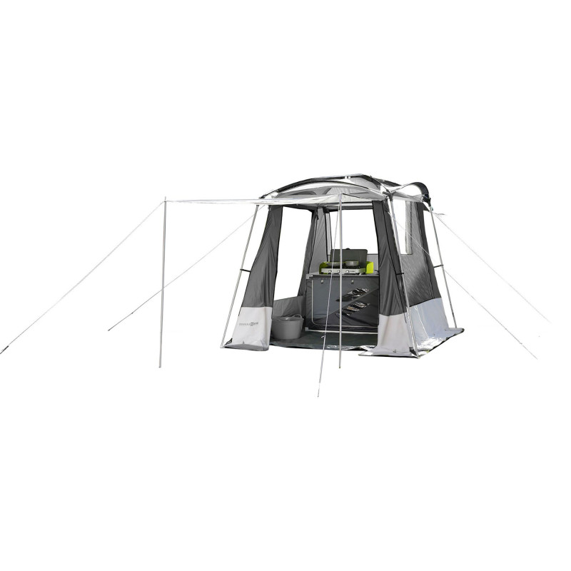 Uniwersalny namiot kuchenny i materiałowy ze stabilną ramą ze stali i włókna szklanego, dużymi oknami oraz zwijanymi drzwiami wejściowymi. Z fartuchem przeciwwiatrowym na całym obwodzie. W zestawie materiał montażowy i torba na namiot.