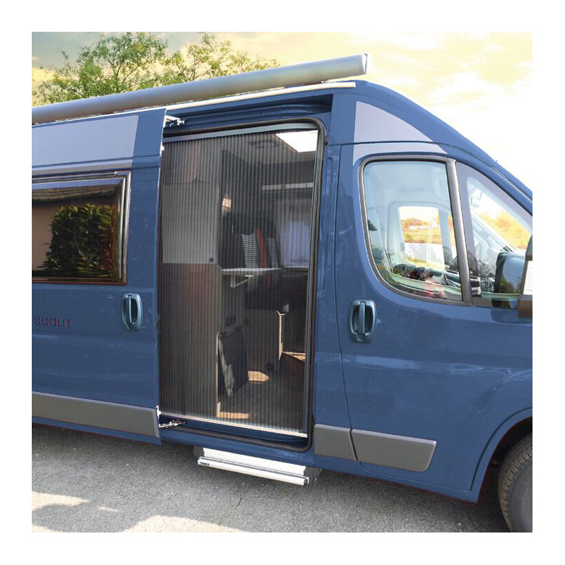 Zasłona przeciw owadom Hindermann do drzwi przesuwnych Fiat Ducato z wysokim dachem H2. Mocowanie magnetyczne umożliwia szybki montaż bez wiercenia. Wielościeżkowy zamek obsługiwany z obu stron pojazdu. Ognioodporna tkanina blokuje ok. 65% promieniowania słonecznego.