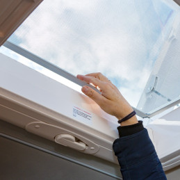 Moskitiera Stella od Hindermann do kabiny kierowcy Fiat Ducato (od 05/2014). Montaż na zewnątrz nad krawędzią drzwi z mocnymi magnesami zapewnia pewne trzymanie. Chroni przed owadami przy otwartych oknach, zapewniając optymalną wentylację kabiny. Trwały materiał.
