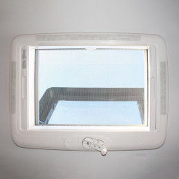 Roleta wewnętrzna Hünerkopf do świetlika DL4 AR (500x500 mm) łączy funkcję zaciemnienia z moskitierą. Podwójne uszczelnienie szczotkowe zapewnia szczelność, a białe profile aluminiowe harmonizują z wnętrzem pojazdu. Szary materiał zaciemniający i czarna siatka.