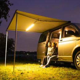 Oświetlenie LED Fiamma do obudowy markiz F45s, F45L i F70. Taśma COB z neutralnym światłem 4000 K (2550 lm, 27,5 W). Klasa IP54. Montaż w rowku obudowy markizy – wystarczy wcisnąć paski na miejsce. Mogą pozostać zamontowane podczas jazdy.