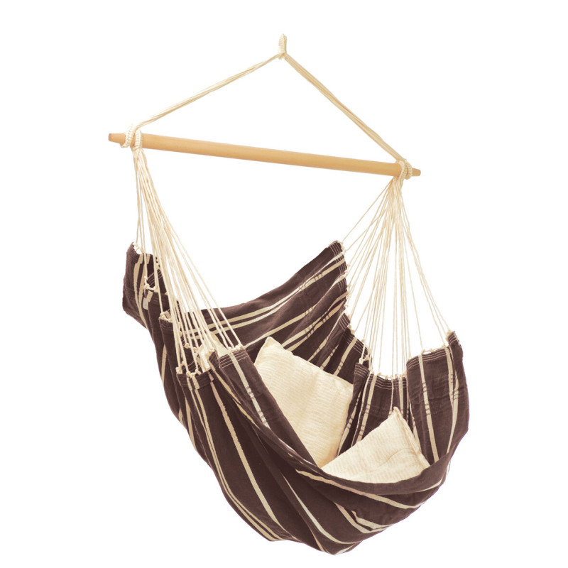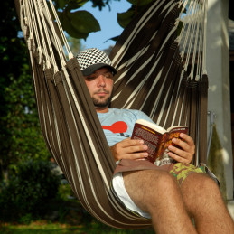 Super miękka tkanina składająca się z 85% bawełny i 15% poliestru jest starannie ręcznie tkana w Brazylii i, jak wszystkie brazylijskie hamaki, jest wyjątkowo duża i wygodna. Drewniany drążek o długości 1,10 m ma odpowiednią długość, aby nawet najwyżsi z nas mogli wygodnie odpoczywać. Ważący zaledwie 3 kg, łatwo go zawiesić lub zdjąć w dowolnym miejscu. Wymagana minimalna wysokość pomieszczenia to około 2,20 m.