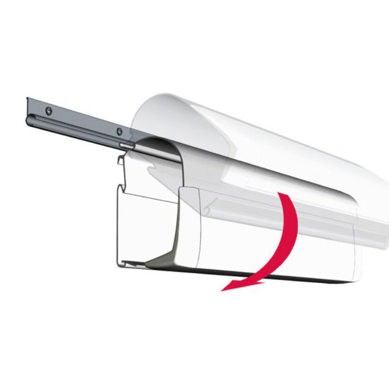 Kompaktowy zestaw silnikowy Fiamma do markizy F80L. Otwieranie za pomocą systemu sterowania przyciskiem ściennym. Kaseta polar white.