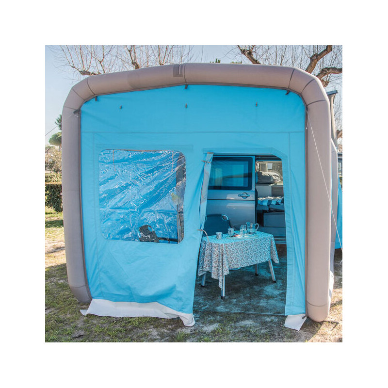 Uniwersalny adapter BENT XL idealnie chroni przed deszczem wyższe pojazdy rekreacyjne (bus, Wohnwagen) dzięki dodatkowemu materiałowi o długości 55 cm. Wykonany z 100% PES poliestru z powłoką PU (słup wody 1500 mm), waży tylko 810 g i ma szerokość 2500 mm. Kompaktowy i wytrzymały – niezbędny element kempingowego wyposażenia.