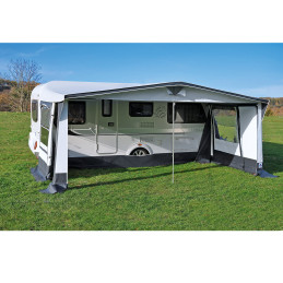 5-częściowa markiza całoroczna jest wyposażona w specjalny profil do mocowania wsporników bezśrubowych (nie dołączone). Posiada klapy przeciwwiatrowe i obszycia pod wszystkimi oknami. Z podwójną osłoną przeciwwiatrową, klamrą do pasa przeciwsztormowego i narożnikiem Vario, który dostosowuje się do przyczepy kempingowej.