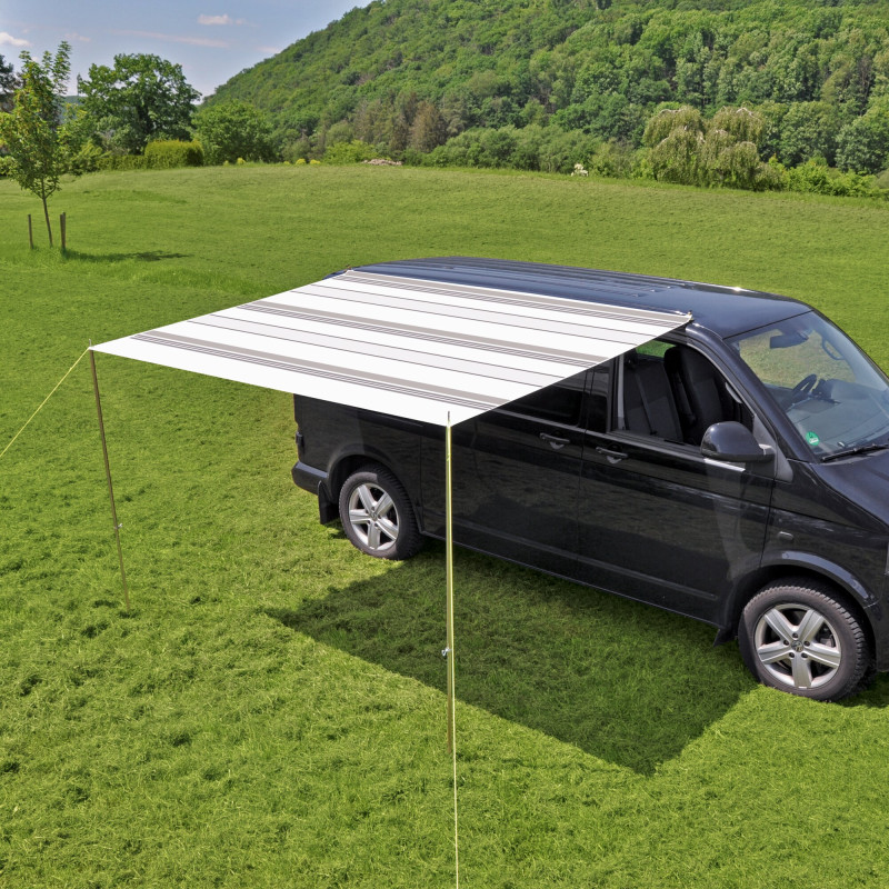 Markiza przeciwsłoneczna o nowoczesnym pasiastym designie to idealny dodatek do vanów! Opcje mocowania: listwa kedrowa (szyna kedrowa) lub słupek łączący (rynna deszczowa). Skorzystaj z ochrony przed promieniowaniem UV i przyjemnej atmosfery. Łatwa do przechowywania w torbie. Odporna na warunki atmosferyczne i trwała.