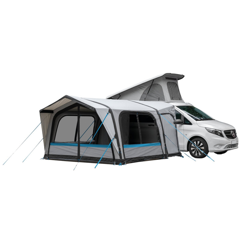 Samodzielna markiza do vana Wise A.I.R. Tech może być szybko rozstawiona dzięki ramie powietrznej A.I.R. Tech z systemem pompowania Oneflate. Dwa łuki podporowe oraz daszek są połączone z rurami dachowymi, co zapewnia wyjątkową stabilność. Wszystkie cztery ściany są zdejmowalne, co pozwala na użycie namiotu jako otwartego pawilonu. Trzy elementy ścienne posiadają okna z siatki z przyciemnianymi osłonami foliowymi oraz zaciemnieniem. Zszywana podłoga chroni przed wiatrem, deszczem i owadami. W zestawie znajduje się wysokiej jakości pompka powietrzna z zaworem nadmiarowym. Dzięki elastycznym opcjom połączeń, markiza do vana Wise A.I.R. Tech może być optymalnie dostosowana do różnych typów pojazdów. Złącze (190 – 240 cm) z bocznymi drzwiami. Wytrzymałe paski zapewniają bezpieczne mocowanie, a punkt dostępu do kabla ułatwia zasilanie. Połączenie realizowane jest za pomocą kedry, słupka łączącego, pasków lub lin odciągowych. W zestawie torba transportowa.
