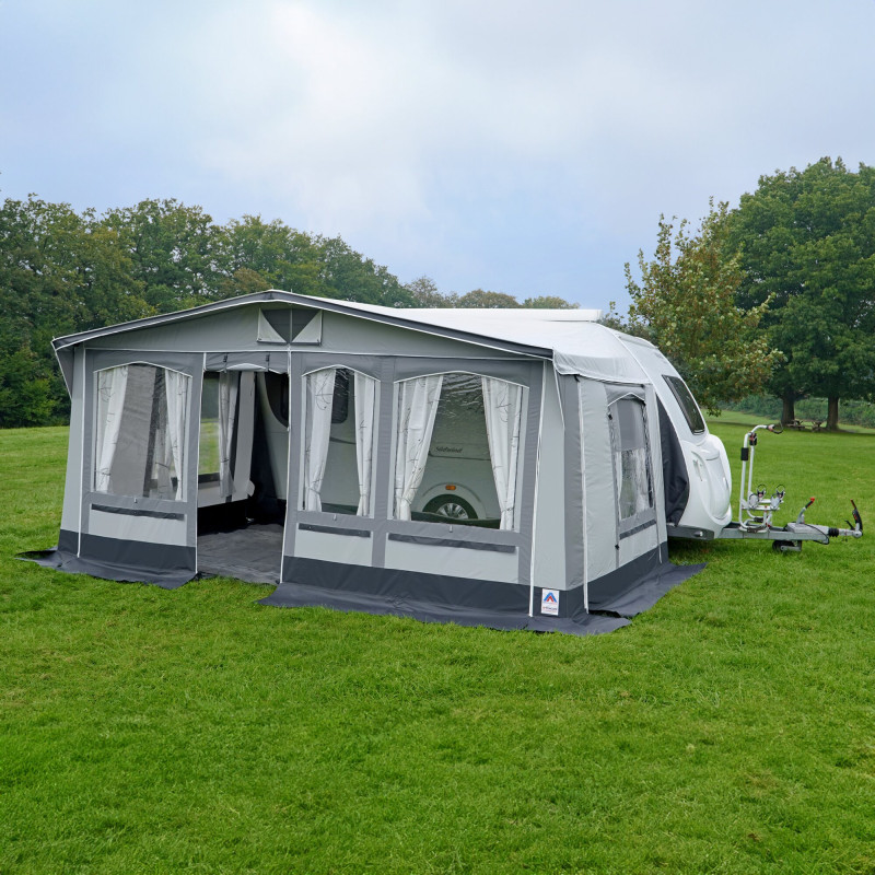 Namiot turystyczny Lazise 280 oferuje elastyczne rozwiązania na wakacje kempingowe. Dzięki pięcioczęściowej konstrukcji i specjalnemu profilowi do bezśrubowych uchwytów mocujących (nie dołączone), jest łatwy w rozstawieniu. Narożnik Vario idealnie dopasowuje się do Twojej przyczepy kempingowej. Zakryte zamki, zamykane klapy okienne i cztery klamry do pasów sztormowych zapewniają ochronę i stabilność. Profile do rynien deszczowych i mocowanie wykuszu oferują dodatkową elastyczność.