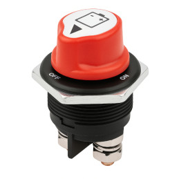 Wyłącznik akumulatora o ciągłym prądzie pracy 300 A umożliwia szybkie odcięcie zasilania całego układu elektrycznego, idealny do samochodów i kamperów/RV jako odłącznik postojowy; montaż w otworze 3/4", konstrukcja uszczelniona z aluminiową płytką ON/OFF, spełnia wymagania CE i zgodnie z regulaminami NHRA jest wymagany przy relokacji akumulatora.